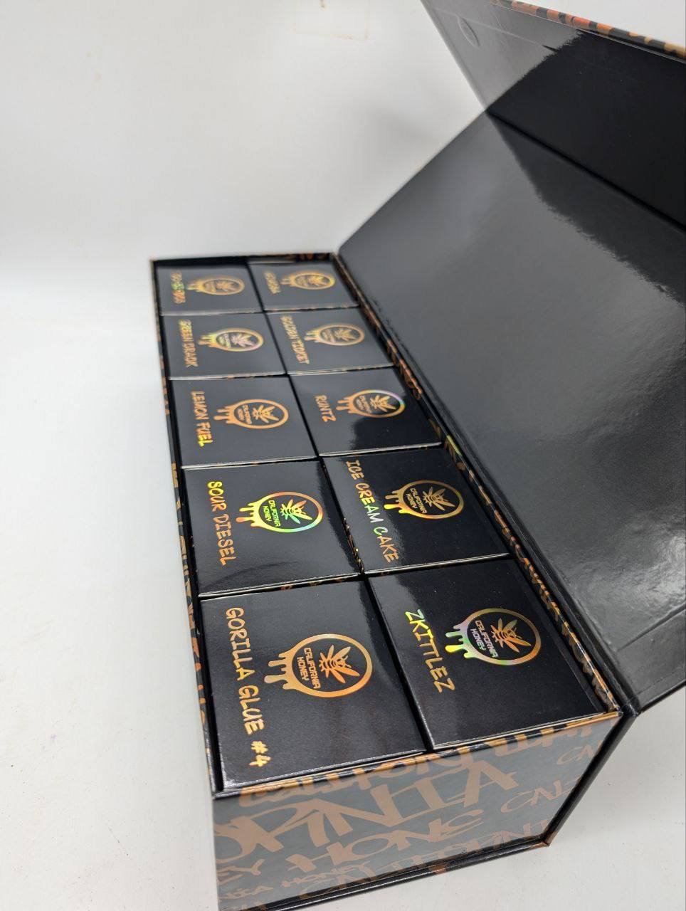1. Lemon Fuel, Sour Diesel, Golden Ticket, Runtz, Ice Cream Cake, Zkittlez, Gorilla Glue #4, Green Drank