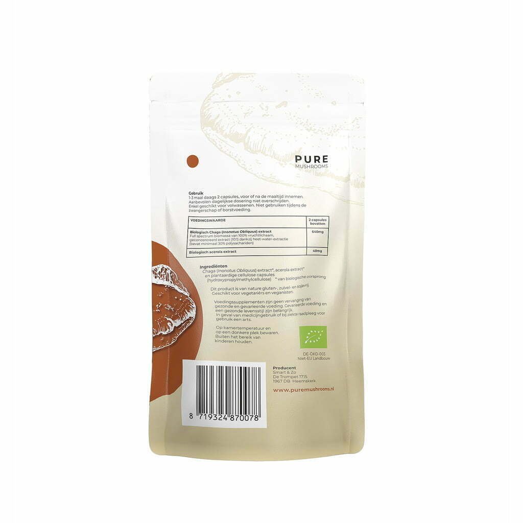 - 320 mg full-spectrum Chaga extract (10:1), 20 mg acerola (Malpgihia glabra) per capsule