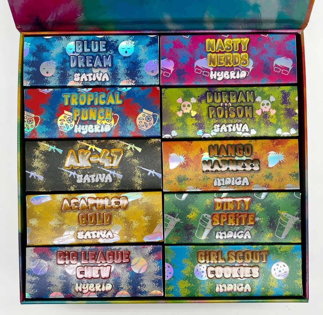 BLUE DREAM(S), TROPICAL PUNCH(H), AK-47(S), ACAPULCD GOLD(S), BIG LEAGUE CHEW(H), NASTY NERDS(H), DURBAN POISON(S), MANGO MADNESS(I), DIRTY SPRITE(I), GIRL SCOUT COOKIES(I), 10PK(Mixed Flavors), 25PK(Mixed Flavors), 50PK(Mixed Flavors), 100PK(Mixed Flavors)